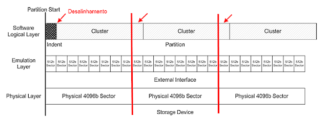 Se não estiver, então cada cluster do sistema de arquivos (também 4 KiB) passa a ocupar, depois da camada de emulação, dois setores físicos (um pedaço de cada um) e isso causa perdas de desempenho terríveis, visto que a placa lógica precisa ler dois setores físicos (8 KiB) para tirar apenas 4 KiB de dados. Na gravação é pior ainda, pois além da perda de desempenho existe um risco de perda de dados associado (num desligamento incorreto), pois para gravar 4 KiB de dados (um cluster do sistema de arquivos), a placa lógica precisa gravar dois setores (8 KiB), regravando também os outros 4 KiB de dados que não fazem parte do cluster que está sendo modificado — isso é chamado de read-modify-write cycle e é péssimo. Esquema de uma partição desalinhada, onde os clusters não batem com os setores físicos: